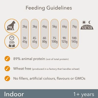 A balanced dry food for indoor cats, helping support 7 signs of healthy vitality and with 89% animal protein, fresh chicken and a delicious recipe that is completely free from wheat.