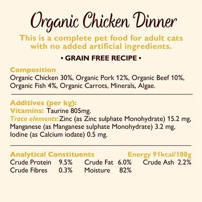 This balanced, grain-free cat food is made with organic ingredients from 100% controlled organic farms including fresh, free-range organic chicken, vitamins and taurine for a complete meal.