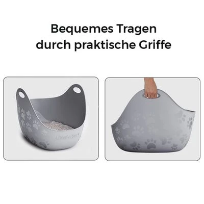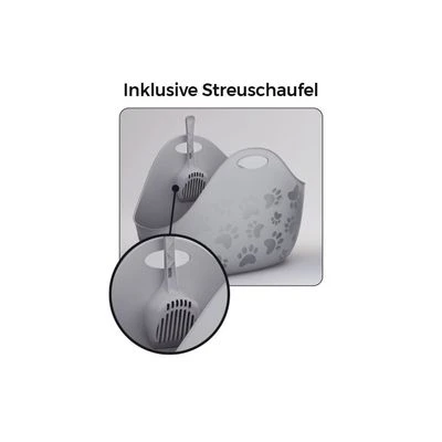 Modern cat litter box with litter scoop, open all the way around and with a lowered entry and high side walls, easy to empty and clean using the litter emptying system and the flexible material.