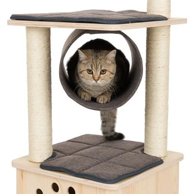 This Modern Living Iona Scratching Tree features a cosy wooden den for hiding away and snoozing. The inside and the roof of this den are softly padded for added comfort. There are other cosy places for your cat to relax on the two platforms, including a lookout at the very top with a comfortable cuddle bed. These levels are connected with stable scratching posts coated with natural sisal, making this tree ideal for claw care. A fun extra included with this Modern Living Iona Scratching Tree is a sturdy play tunnel, which your cat can travel through or use as a space to relax. The Modern Living Iona Scratching Tree offers a modern design and is made with high-quality textiles that fit beautifully into many homes.