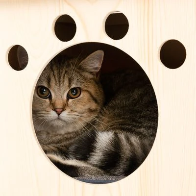 - Cosy wooden den: with a round entrance and small lookout area, with a padded laying area inside and on the roof, ideal for hiding, relaxing and sleeping
