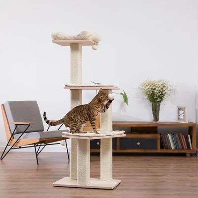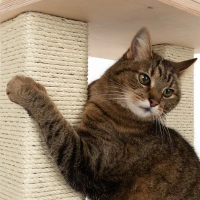 A space-saving cat tree with long 11cm diameter sisal scratching posts, as well as real wood platforms, removable cushions and a cosy look-out spot at the top, Oeko-Tex® certified. It is ideal for large breed cats.